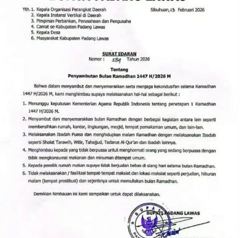 Padang Lawas, mediaberantaskriminal.com – Bupati Padang Lawas mengeluarkan Surat Edaran Jum’at (13/02/2026). Surat No...