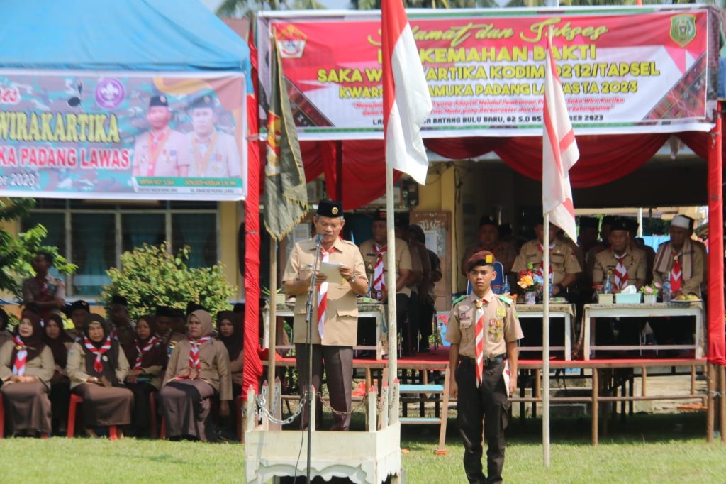 Padang Lawas – Media Berantas Kriminal | Pelaksana Tugas (PLT) Bupati Padang Lawas, drg. H. Ahmad Zarnawi Pasaribu, CHt, MM, M.Si, MH (AZP) diwakili Asisten III Pemkab Drs.H.Amir Soleh Nasution bertindak sebagai Inspektur Upacara (Irup) sekaligus membuka secara resmi Perkemahan Saka Wira Kartika Kodim 0212/Tapanuli Selatan (TS) Kwartir Cabang (Kwarcab) Pramuka Kabupaten Padang Lawas Tahun 2023, bertempat di Lapangan Bola Desa Batang Bulu Baru Kecamatan Barumun Selatan, Jumat pagi (03/11/2023).