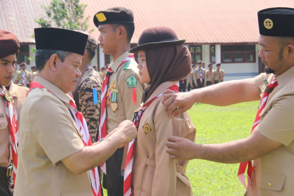 Selanjutnya dilaksanakan penyematan tanda peserta secara simbolis kepada 3 orang peserta Perkemahan Saka wira Kartika Kodim 0212/TS.
