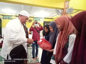 Pemberian santunan uang saku kepada 75 orang anak yatim @Rp 100.000 dan satu kotak nasi dengan menu daging masak klio diberikan langsung di serambi Masjid Jami’ Belawan, Rabu (26/10/2022) qobla dhuhur.