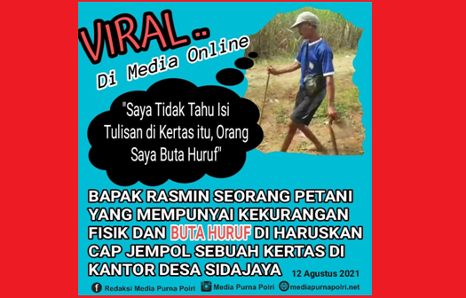 “Saya buta huruf tidak bisa baca karena tidak sekolah, disuruh tandatangan, saya enggak bisa, akhirnya saya disuruh cap jempol. Nanti yang aslinya buat pak Rasmin ya, saya pegang photo kopinya aja, tapi sampai sekarang tulisan itu belum dikasih,” tutur Rasmin kepada awak media.