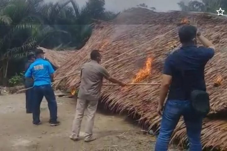 [Petugas BNN Langkat, Aparat Kecamatan, Aparat Desa dibantu oleh warga membakar barak narkoba dan perjudian di Desa Perdamaian, Kecamatan Binjai, Kabupaten Langkat.