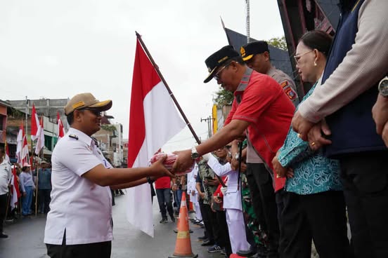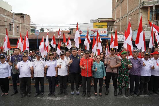 Di tengah rintik gerimis ratusan bendera merah putih berkibar di pusat Kota Balige, ibu kota Kabupaten Toba pada Jumat (01/08/2025) dalam rangka gerakan pembagian sepuluh juta juta bendera untuk menyongsong HUT ke-80 Kemerdekaan Republik Indonesia Tingkat Kabupaten Toba.