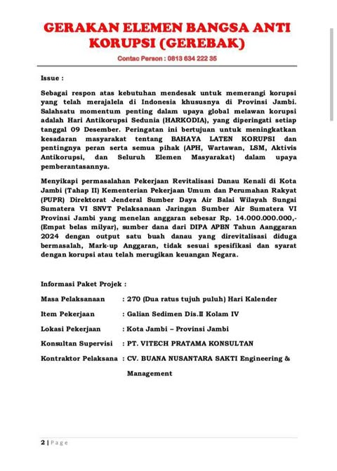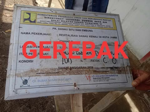 Dalam hal ini terkait dugaan temuan akan penyimpangan paket pekerjaan ” revitalisasi danau Sipin tahap II(dua ) kota Jambi, dengan nama pekerjaan galian sendimen DIS, Dua kolam IV .yang berlokasi di kota Jambi -provinsi Jambi , dengan angaran di duga sebesar 14. 000.000.00 rupah ( empat belas miliar rupiah) . bersumber dana APBN tahun 2024, dengan CV pelaksanaan buana Nusantara sakti , Egenering dan manajement , dan konsultan supervisi PT VITCH, Pratama konsultan.