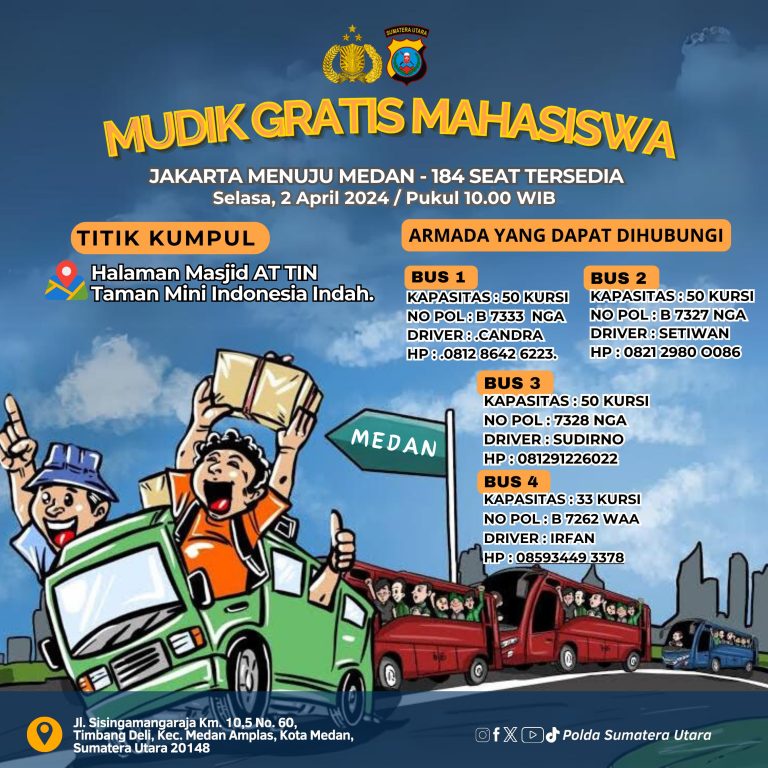 Jakarta – Media Berantas Kriminal | Polda Sumut menyediakan sebanyak empat armada bus gratis yang akan membawa mahasiswa yang belajar di Jakarta mudik ke Medan saat libur lebaran Idul Fitri 1445 Hijriah.