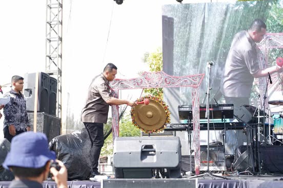 Bupati Toba kemudian memukul gong sebagai pertanda dimulainya lomba senam kreasi dan kuliner.