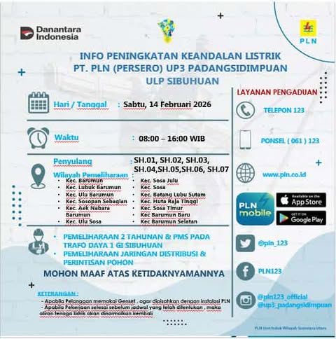 Dengan ini kami informasikan bahwasanya akan ada dilakukan Pemadaman terkait pekerjaan Pemeliharaan 2 Tahunan & PMS Pada Trafo Daya 1 Gardu Induk Sibuhuan, Pemeliharaan Jaringan Distribusi dan Perintisan Pohon.