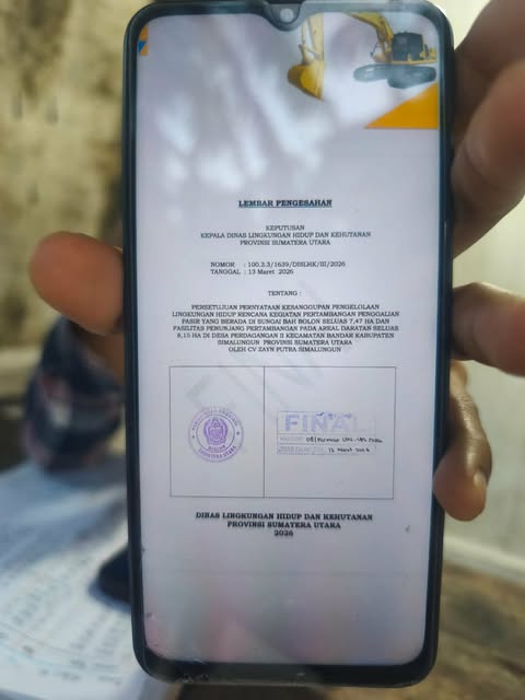 Selain itu, dokumen lain yang ditunjukkan berupa persetujuan lingkungan (UKL-UPL) dari Dinas Lingkungan Hidup dan Kehutanan Provinsi Sumatera Utara tertanggal 13 Maret 2026. Dokumen tersebut merupakan salah satu syarat penting, namun bukan izin operasional tambang.