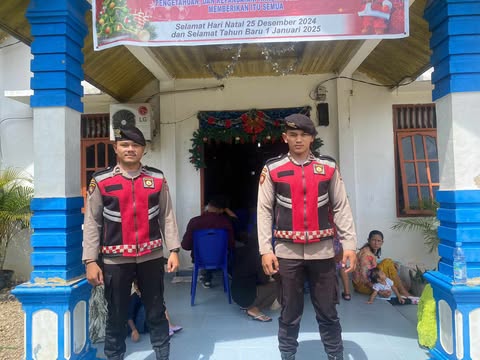 Padang Lawas, Media Berantas Kriminal – Personil Pos Pam II Sosa, Kepolisian Resor Padang Lawas (Polres Palas), Bripda Jonatan dan Bripda Andri Sianturi menggelar patroli dan pengamanan ke sejumlah rumah ibadah umat kristiani dalam upaya menjaga situasi Kamtibmas momentum perayaan Nataru (Natal Tahun 2024 dan Tahun Baru 2025), di wilayah Pos Pam II Sosa, Minggu (22/12/2024) sekira pukul 10.30 wib hingga selesai.