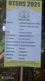 Terlihat pada plank proyek, nama paket : pembangunan saluran induk (primer) Kampung Bundar-Kampung Kebun Tanah Terban Kecamatan Karang Baru, nomor kontrak : 10/kontrak/CK-Tender/2021, nilai kontrak : Rp. 2. 298. 418. 000, konsultan perencana : CV. Techno Team Consulindo, konsultan pengawas : CV. Miftahul Arzaq Consultant, pelaksana : CV. Kamasa, tanggal mulai : 10 Mei 2021, tanggal selesai : 01 Oktober 2021.