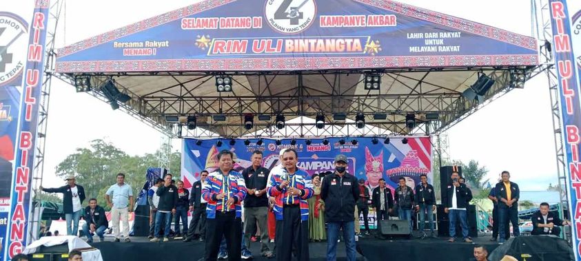 Pernyataan Calon Bupati Dairi Rimso Maruli Sinaga disambut massa dengan meriah, sorak sorai dan bertepuk tangan sambil mengaungkan Yel iyel kemenangan “RIM ULI BINTANGTA Menang,,,RIM ULI BINTANGTA coblos No 4 jadi Bupati.