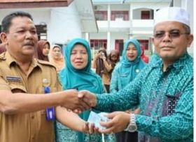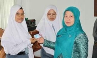 Madina – Media Berantas Kriminal | Kepala Dinas Kependudukan dan Catatan Sipil (Dukcapul) Kabupaten Mandailing Natal (Madina) Ridwan Nasution bersama Ketua Bidang II TP PKK Asmawati Alamulhaq menyerahkan Kartu Tanda Penduduk (KTP) kepada tiga sekolah di Panyabungan.
