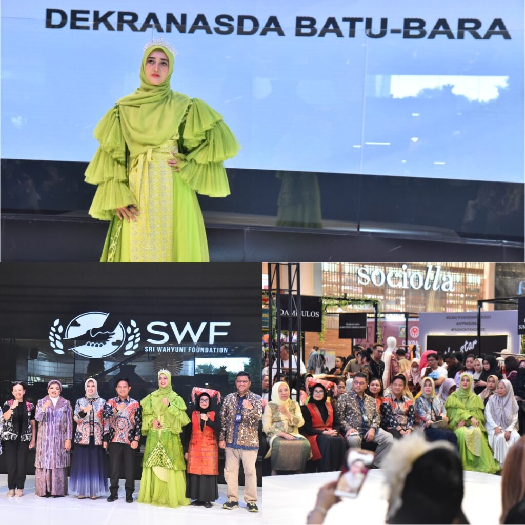Ketua TP PKK Maya sendiri memperagakan wastra karya anak Batu Bara yang dirancang oleh designer Batu Bara Rissa Putri.