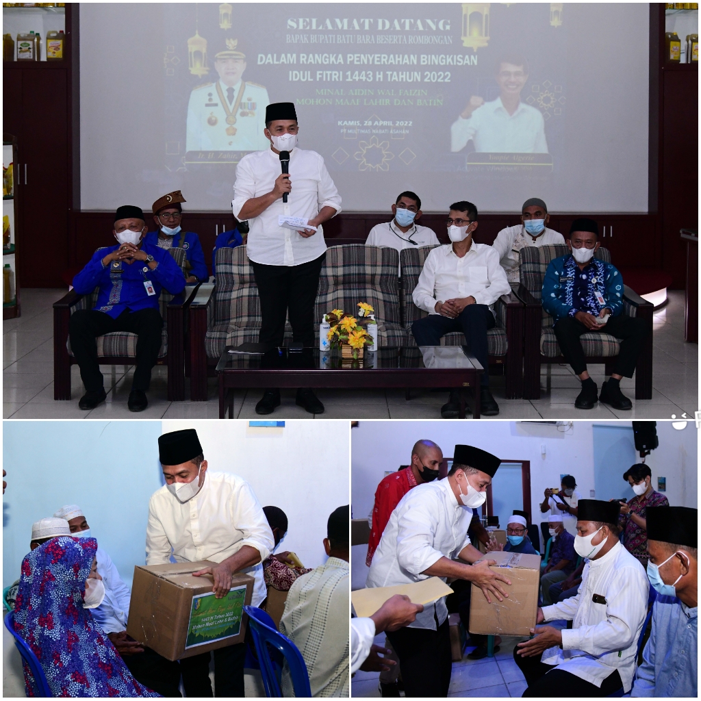Batu Bara – Media Berantas Kriminal | Mendekati Hari Raya Idul Fitri 1443 Hijriah, Bupati Batu Bara, Ir. H. Zahir, M.AP, menyerahkan bingkisan lebaran dari PT. Multimas Nabati Asahan (MNA), kepada para anak yatim, dhuafa, marbot, bilal mayit dan penggali kubur. Penyerahan bingkisan lebaran tersebut dilaksanakan di Aula PT. MNA, Access Road Inalum Dusun IV, Desa Kuala Tanjung, Kecamatan Sei Suka, Kabupaten Batu Bara, Kamis (28/04/2022).