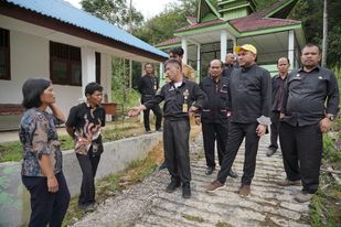 Dalam kunjungan ini, Bupati sempat berkeliling di Kantor Kepala Desa, melihat kondisi bangunan kantor Kepala Desa, serta berdiskusi tentang program pembangunan di sana.