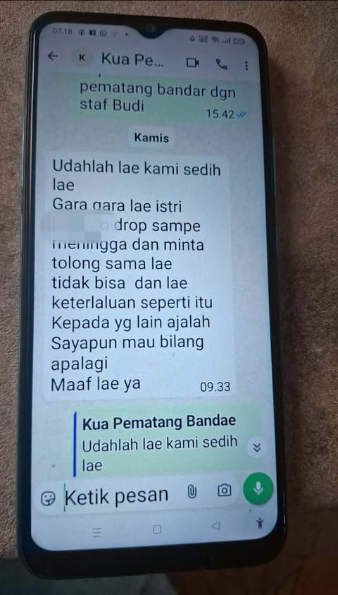 Simalungun, Media Berantas Kriminal – Salah seorang wartawan, Poltak Simanjuntak terkejut, rasa yang cukup terasa di dalam hati lantaran dituding, penyebab dari kematian seorang istri dari Kepala KUA (Kantor Urusan Agama) yang bertugas di Kabupaten Simalungun, yang disampaikan melalui chattingan WhatsApp, pesan di kolom teks, dan kirim chatting, pada Kamis (25/12/2025) kemarin.