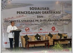 Ir. Andi Fiardi MT juga menyampaikan tujuan dari kegiatan sosialisasi hari ini yaitu memberikan pemahaman serta pedoman bagi para pengguna jasa dan para stakeholder untuk pencegahan tindak pidana korupsi dan mendukung efektifitas agar terciptanya budaya anti gratifikasi, dan mengevaluasi progress pencapaian program Stranas PK di Pelabuhan Belawan.