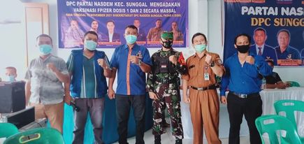Vaksinasi Pfizer Dosis 1 dan 2 diadakan secara masal daerah kecamatan sunggal sekitarnya, DPC PARTAI NASDEM juga melayani masyarakat, baik itu dari luar Kecamatan Sunggal. Di Dampingi Oleh Babinsa 01 AGUS Kecamatan Sunggal yang hadir.