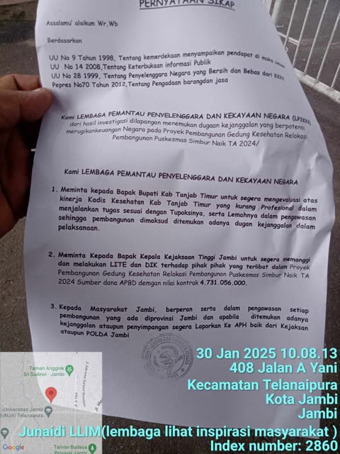 Untuk itu, kami dari lembaga pemantau penyelengara, negara dan kekayaan negara (LP2KN) meminta kepada bapak kepala kejaksaan tinggi (Kejati) Jambi, untuk segera memanggil dan melakukan LITE, dan DIK, terhadap pihak-pihak yang di duga terlibat dalam proyek pembangunan gedung kesehatan relokasi pembangunan puskesmas simbur naik tahun 2024 tersebut.