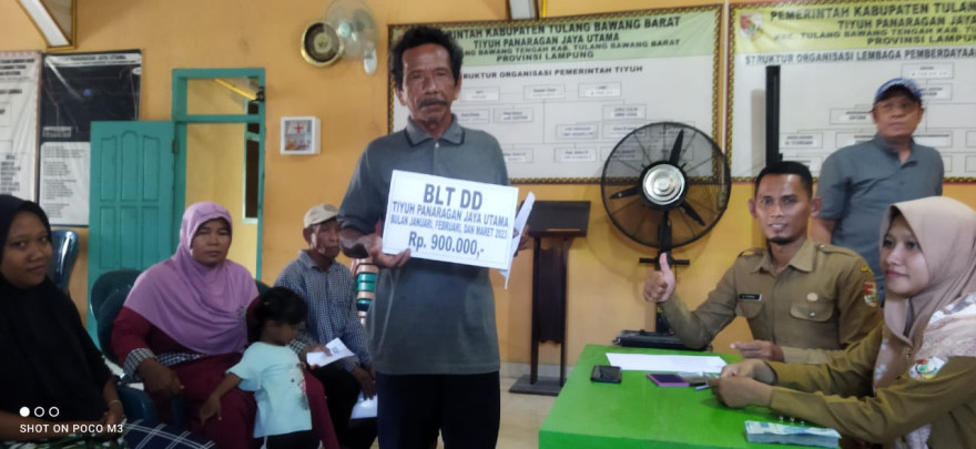 BLT-DD bulan Januari-Maret 2023 telah disalurkan pemerintah tiyuh kepada 23 KPM (Keluarga Penerima Manfaat) setiap KPM masing-masing menerima sebesar Rp 900.000,-.