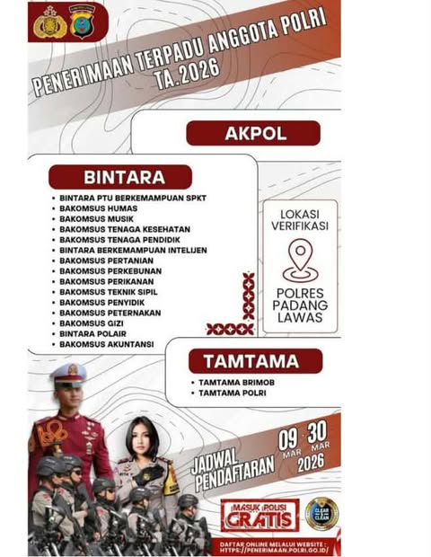 PADANG LAWAS, mediaberantaskriminal.com – Sebagai upaya meningkatkan kapasitas dan kualitas personel serta memenuhi kebutuhan tenaga profesional di berbagai bidang strategis, Kepolisian Negara Republik Indonesia (POLRI) resmi membuka pendaftaran Penerimaan Terpadu Anggota POLRI Tahun Anggaran 2026 untuk jenjang Akademi Kepolisian (AKPOL), Bintara, dan Tamtama. Pendaftaran yang dibuka mulai tanggal 09 hingga 30 Maret 2026 ini menjadi kesempatan emas bagi seluruh rakyat Indonesia yang ingin berkontribusi langsung dalam menjaga keamanan dan ketertiban negara.