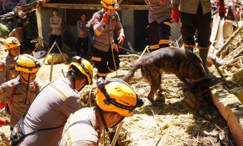 Sibolga, Media Berantas Kriminal – Proses pencarian korban tertimbun longsor di wilayah Kota Sibolga dan Kabupaten Tapanuli Tengah terus dilakukan tanpa henti oleh tim gabungan Polri. Pada Selasa, 09 Desember 2025, Unit Polsatwa K-9 Dit Samapta Polda Sumut bersama personel BKO SAR Dit Polsatwa Baharkam Polri kembali melakukan penyisiran dan pelacakan di area terdampak.