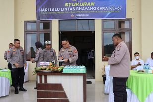 Pantauan Media di lapangan, syukuran HUT Lalu Lintas Bhayangkara ke-67 diwarnai dengan pemotongan Nasi Tumpeng dan pemberian kue kepada Personil Lantas tertua Aiptu Kasija dan termuda kepada Bribda Muhammad Fatoni Alwahid Hasibuan.
