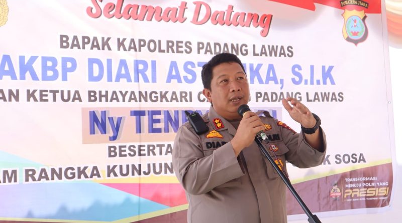 Padang Lawas – Media Berantas Kriminal | Kapolres Padang Lawas AKBP Diari Astetika SIK bersama Ketua Bhayangkari Cabang Ny.Tenry Diari Astetika mengunjungi Polsek Sosa dalam rangka Kunjungan Kerja sekaligus Silaturrahim dengan masyarakat Kecamatan Sosa, bertempat di halaman Mapolsek Sosa, Jum’at (08/09/2023).