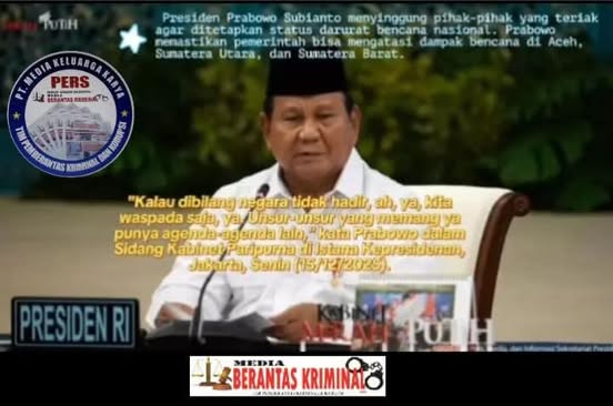 Jakarta, Media Berantas Kriminal – Presiden Prabowo Subianto menyinggung pihak-pihak yang teriak agar ditetapkan status darurat bencana nasional. Prabowo memastikan pemerintah bisa mengatasi dampak bencana di Aceh, Sumatera Utara, dan Sumatera Barat. Hal itu disampaikan Prabowo dalam Sidang Kabinet Paripurna, di Istana Negara, Jakarta, Senin (15/12/2025). Prabowo menyebut semua kekuatan sudah dikerahkan ke lokasi bencana dan situasi kini terkendali.