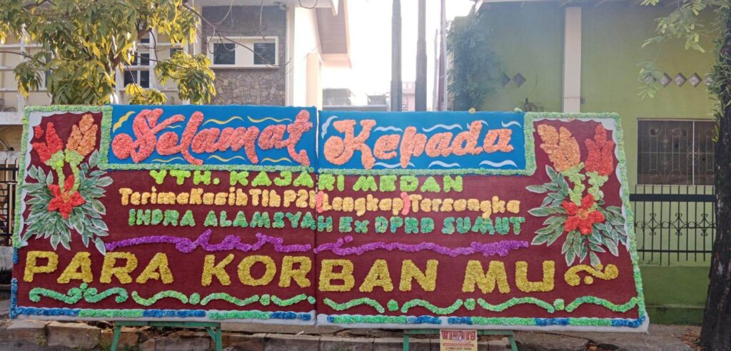 Medan – Media Berantas Kriminal | Puluhan papan bunga terpampang dengan tulisan “ Selamat Kepada Indra Alamsyah kasusnya P-21, terima kasih Kejari Medan, di sepanjang jalan Adinegoro Medan tepatnya disamping gedung Kejari Medan.