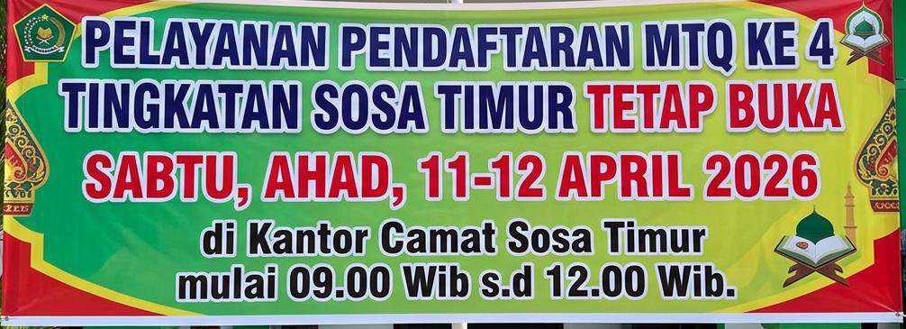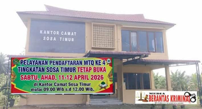 PADANG LAWAS (mediaberantaskriminal.com) – Panitia Musabaqoh Tilawatil Qur’an (MTQ) Ke 4 Kecamatan Sosa Timur tetap menerima Pendaftaran Peserta MTQ di hari Sabtu- Minggu, Sabtu, (11/04/2026)