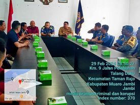 Rapat tersebut di pimpin langsung oleh kepala imigrasi propinsi Jambi bapak Ari pembrianto, dan di hadiri beberapa unsur instansi terkait “diantaranya sebagai berikut” dari pihak KSOP pelabuhan talang duku Jambi, pihak imigrasi propinsi Jambi, pihak subsektor kepolisian taman Rajo, dan pihak kecamatan taman Rajo (pak Rizki), pihak kesbang pol (kesatuan bangsa dan politik) kabupaten Muaro Jambi, serta pihak dari Bandan intelen negara (BIN), dan jajaran babinkamtibmas setempat.