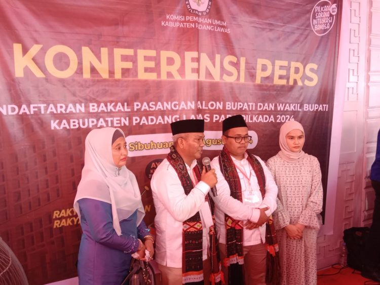 PADANG LAWAS, Media Berantas Kriminal – Usai melaksanakan pendaftaran, pasangan calon Bupati dan Wakil Bupati Kabupaten Padang lawas (Cabup dan Cawabup Palas) drg. H. Ahmad Zarnawi Pasaribu, C.Ht., MM., M.Si., MH dan Muhammad Ifdal Hasayangan Harahap, SE, MM., (Adil) melakukan konferensi pers di kantor KPU Palas.