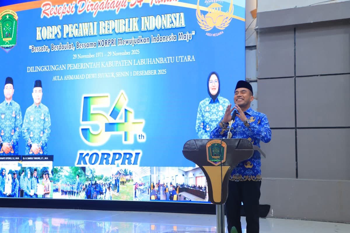 Labura, Mediaberantaskriminal.com – Wakil Bupati Labuhanbatu Utara, Dr. H. Samsul Tanjung, ST., MH, memimpin upacara Peringatan Hari Ulang Tahun ke-54 KORPRI Tahun 2025 di Halaman Kantor Bupati Labuhanbatu Utara, Aek Kanopan, Senin (1/12).